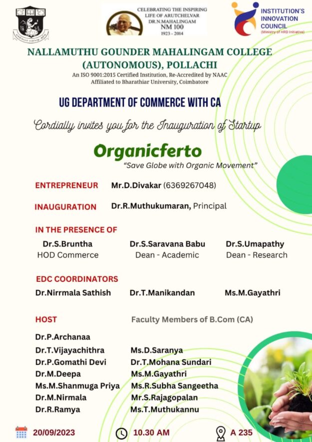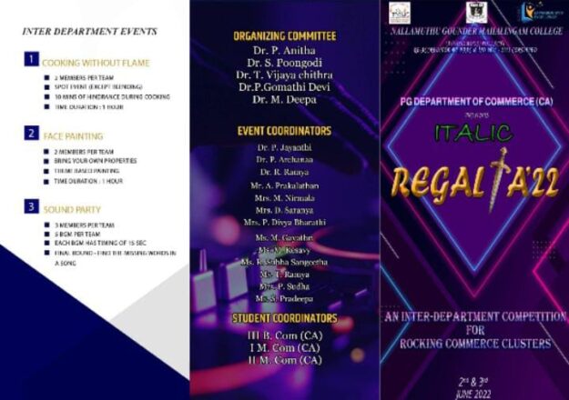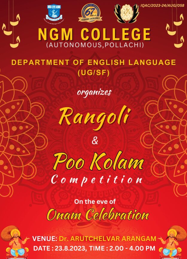 The Department of English Language organize poo kolam: Rangoli competition on account of Onam festival Arut Selvar Arangam on 23/08/2023 between 2pm and 4pm.