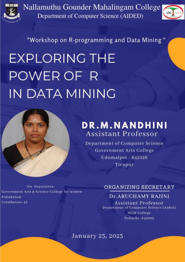 Department of Computer Science (Aided) Workshop on ” R-Programming and Data Mining “ Exploring the Power of R in Data Mining An introduction to the R programming language and its applications in data mining was delivered by Dr. M. Nandhini. The workshop aimed to familiarize participants with the basic concepts and syntax of R, and…