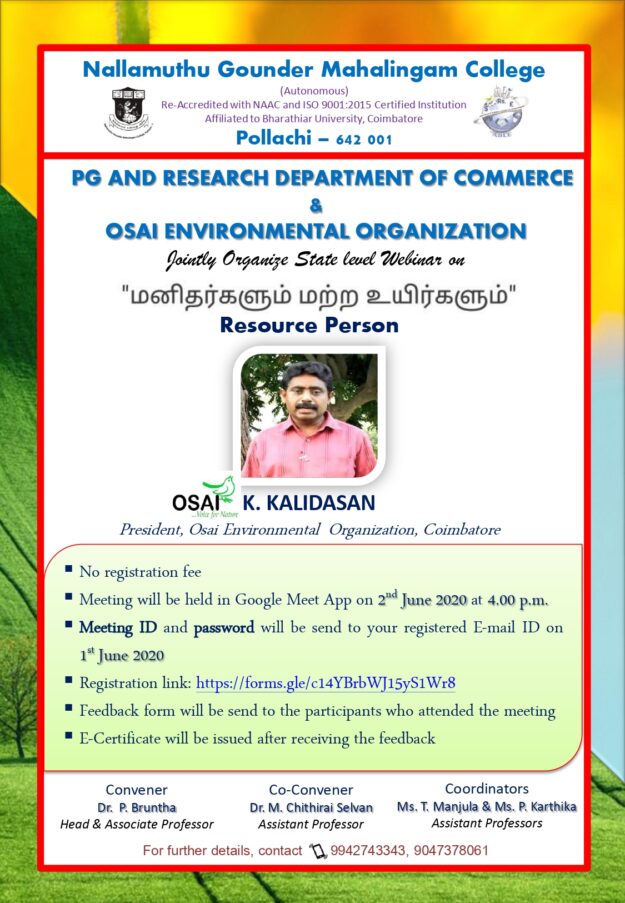 The resource person of the seminar was OSAI .K.KALIDASAN, President, Osai Environmental Organization, Coimbatore. No registration fees and also Meeting conducted through Google Meet App on 2nd June 2020 at 4.00 p.m. The seminar on the topic of “மனிதர்களும் மற்ற உயிர்களும்” explores the relationship between humans and other living beings. It discuss the interconnectedness and…