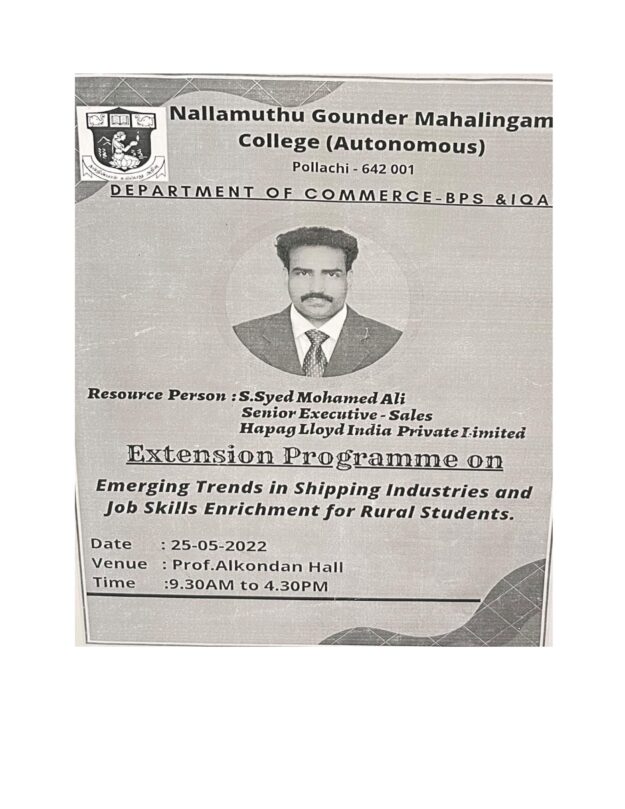 Department of Commerce-BPS organized an Extension Programme on “EmergingTrends in Shipping Industries and Job Skill Enrichment for Rural Students” on 25th May 2022 from 9:30 a.m to 4:30 pm through offline mode. Mr. S. Syed Mohanmed Ali, Senior Executive Sales, Hapag Llyod India Private Limited, Chennai acted as a resource person.