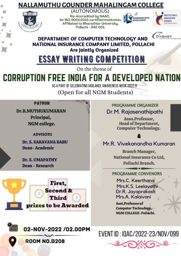 B.Sc., CT – Essay Writing Competition on the theme of “Corruption Corruption Free Society – My Right”, as a part of celebrating National Vigilance Awareness Week 2023 Event – Essay Writing Competition This is an Essay Writing Competition on the theme of “Corruption Free Society – My Right” as a part of celebrating National Vigilance Awareness Week…