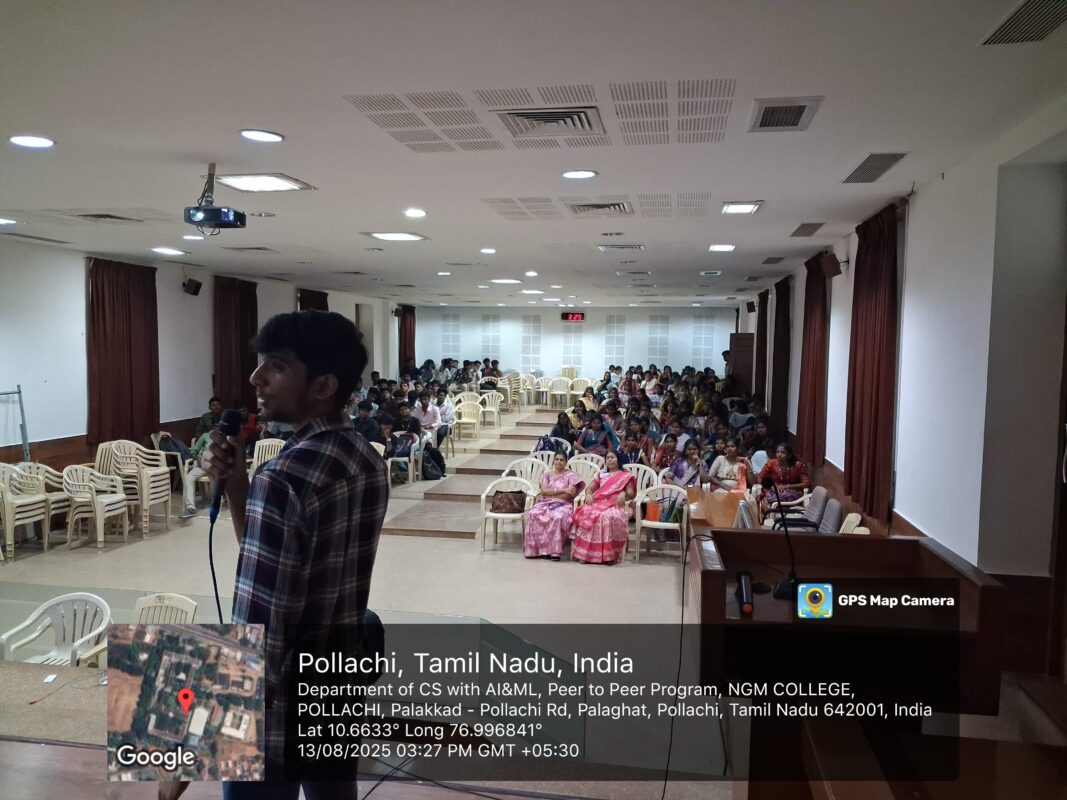 The Peer-to-Peer Seminar titled “Emerging Trends and Applications of AI & ML in the Digital Era” was conducted by R. Nagarjuna, a student of B.Sc Computer Science with AI & ML, on 13th August 2025 at Alkondan Hall, NGM College, Pollachi. The seminar aimed to provide students from all three years (I, II, and III Year) with a deeper understanding of the latest advancements in Artificial Intelligence and Machine Learning, and their broad range of applications in various industries.