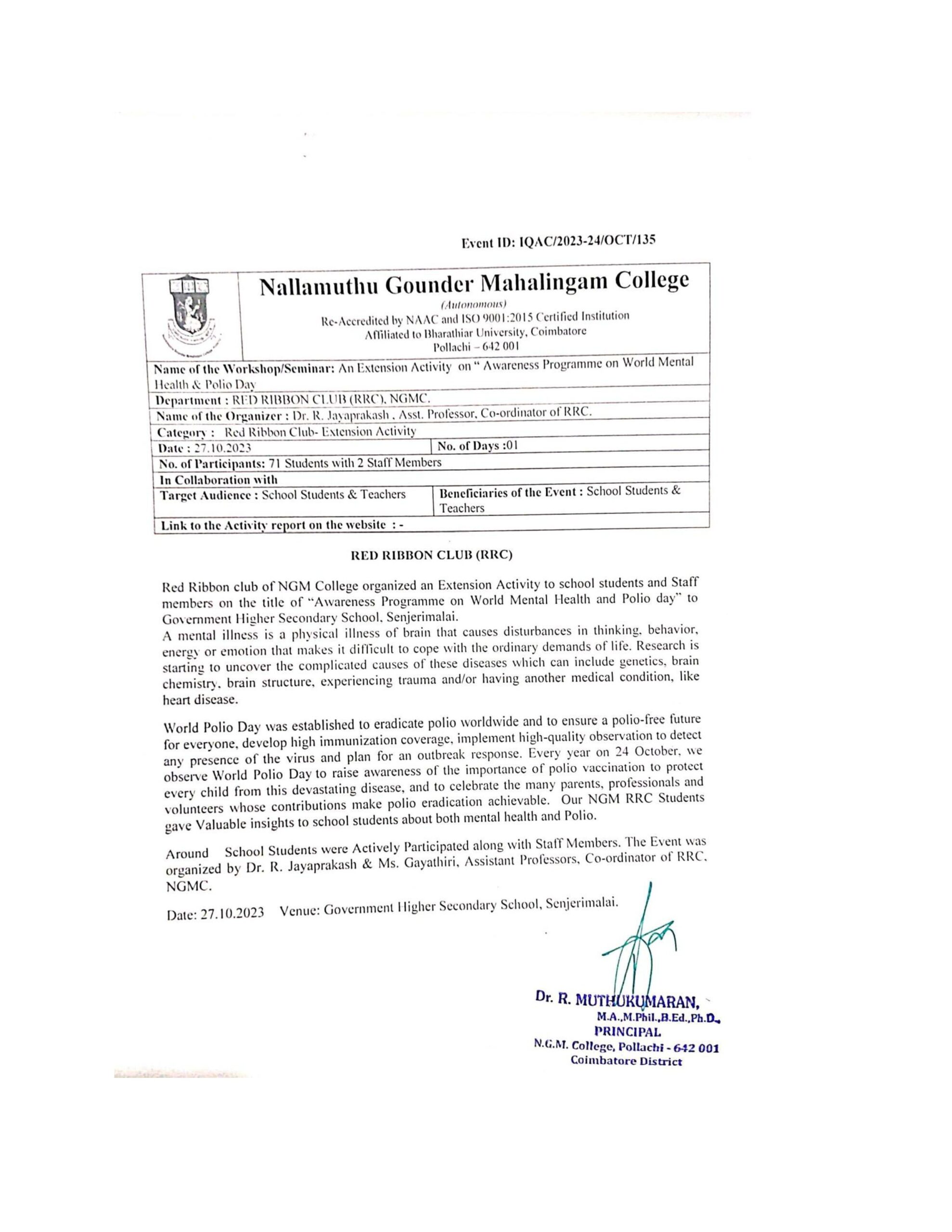 RED RIBBON CLUB – (RRC)- World Mental Health & Polio Day