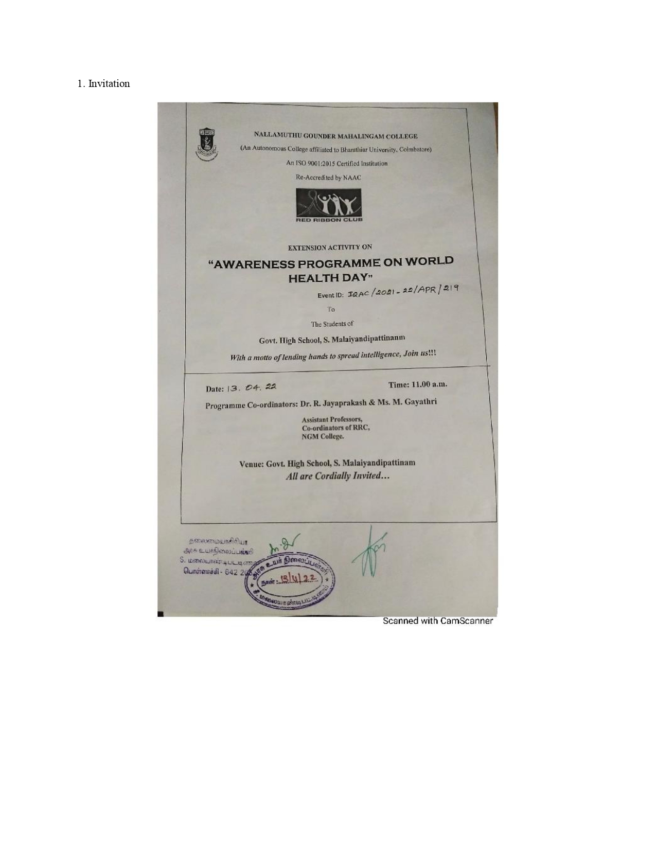 RRC- RED RIBBON CLUB – Awareness Programme on World Health Day