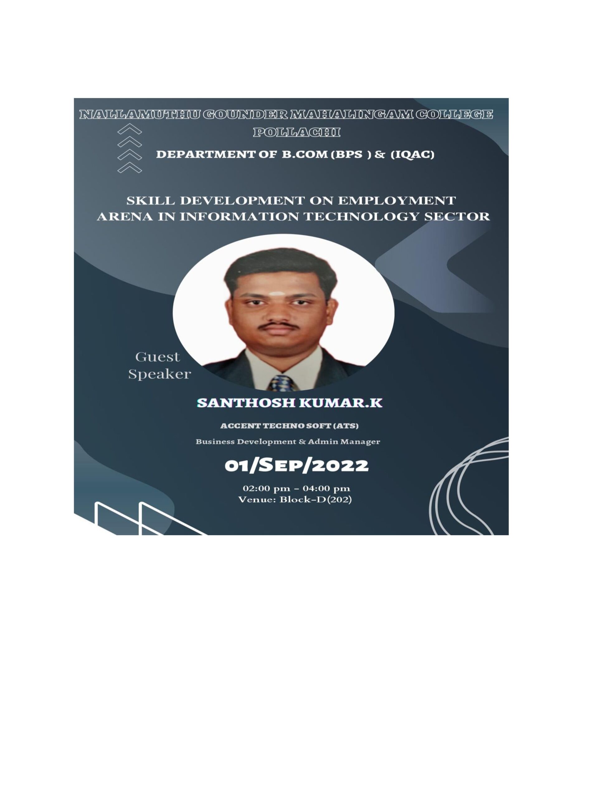 Department of Commerce-BPS organized an Guest Lecture on “SKILL DEVELOPMENT ON EMPLOYMENT ARENA IN INFORMATION TECHNOLOGY SECTOR” 1st September 2022 from 2:00 p.m to 4:00 pm through offline mode. Mr. K. SANTHOSH KUMAR, ACCENT TECHNO SOFT (ATS), Business Development & Admin Manager acted as a resource person.