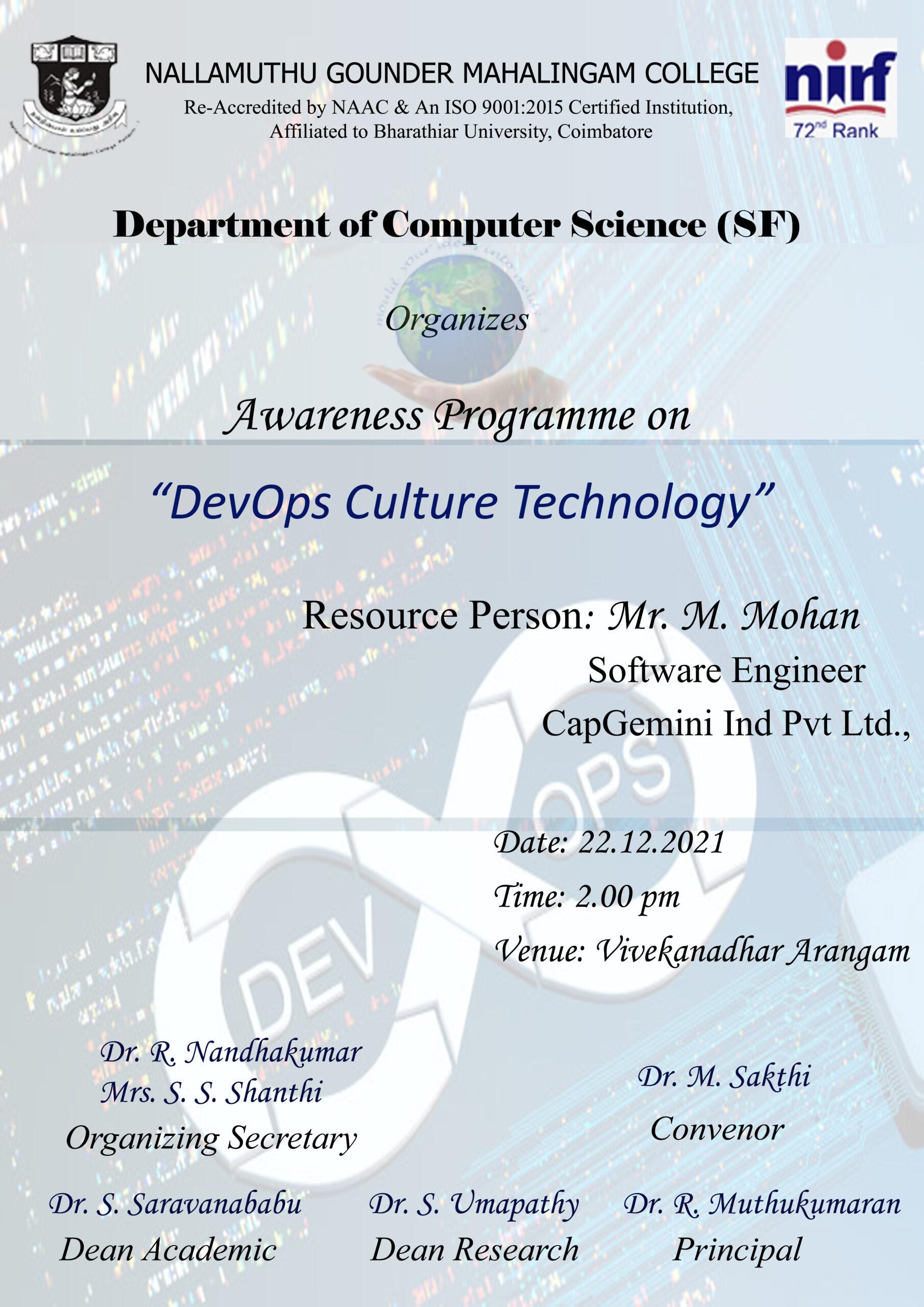 The Department of Computer Science (SF), is organizing an awareness programme on “DevOps Culture Technology” for the students. The resource person for the programme is Mr. M. Mohan, a Software Engineer at Capgemini India Pvt. Ltd. The programme aims to enhance the students’ skills and knowledge in DevOps, a culture and set of practices that bridge the gap between development and operations teams. Through this programme, students will gain insights into the various DevOps tools and technologies used in the industry, and how they can be applied to improve software development and delivery processes.