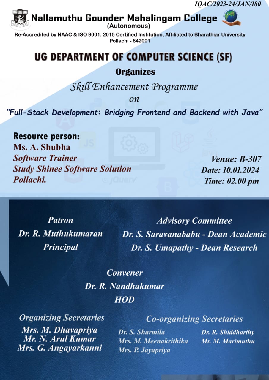 The UG Department of Computer Science (SF) has organized a Skill Enhancement Programme on “Full Stack Development: Bridging Frontend and Backend with Java” that helps our students to delve into the latest programming languages and increase students flexibility and adaptability, making it easier to switch between different projects and technologies.