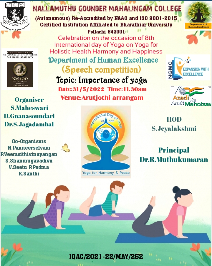 Celebration on the occasion of 8th International Day of Yoga on “Yoga for Holistic Health Harmony and Happiness” – Speech Competition organized by the Department of Human Excellence on ‘Importance of Yoga’ on 31.05.2022. Welcome address & Meditation by Dr.C.Jagadambal Assistant professor, Department of Human Excellence. And Ms.S.Maheswari, Assistant professor, Department of Human Excellence, gave an introductory address. Mrs.Gnanasoundari, Assistant professor, Department of Human Excellence gave the vote of thanks at the end of the programme. 14 Students from various department participated and benefited in this programme.
