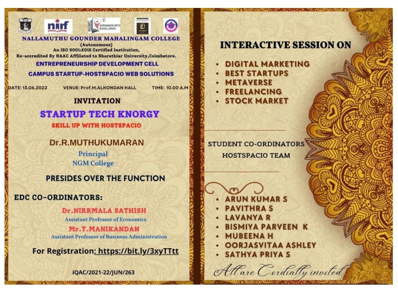 Entrepreneur Development Cell and Department of Economics in association with Institution’s Innovation Council organised a program “ Start Tech Knorgy” skill up with Hotspacio on 13.06.2022.