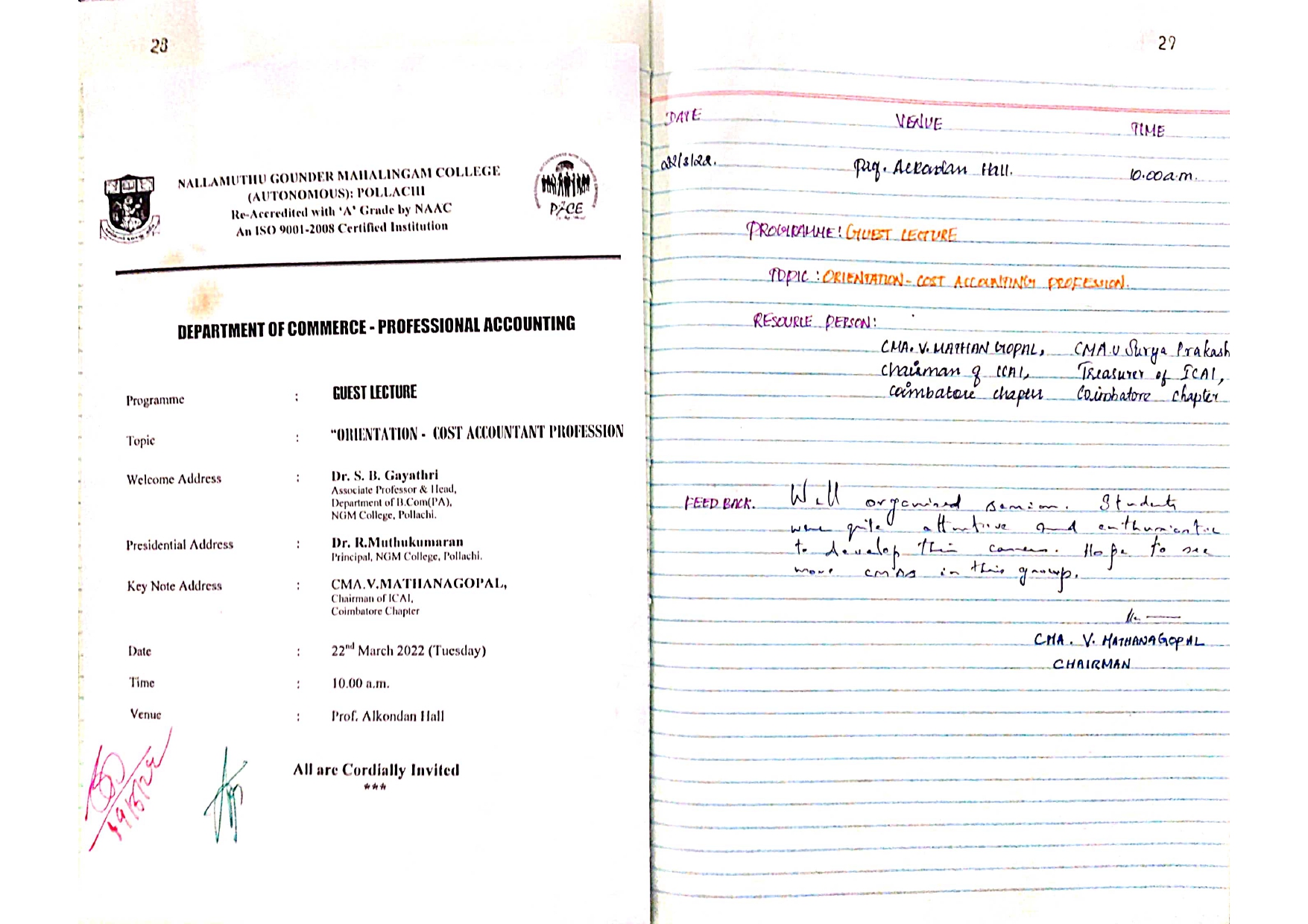 The Department of Commerce – Professional Accounting has arranged a Career Counseling program on 22nd March 2022. The Resource persons are: CMA.V.MATHANAGOPAL, Chairman of ICAI and CMA.U.Suriyaprakaksh, Treasurer, ICAI Chapter, Coimbatore. The resource persons have clearly explained about the Cost Accountant Profession, the stages of entries like Foundation, Intermediate and Final and opportunities in the finance sectors. The session was interactive and 160 students of B.Com (PA) department were benefitted. Along with the students, Five Faculty members of the department have also attended the program.