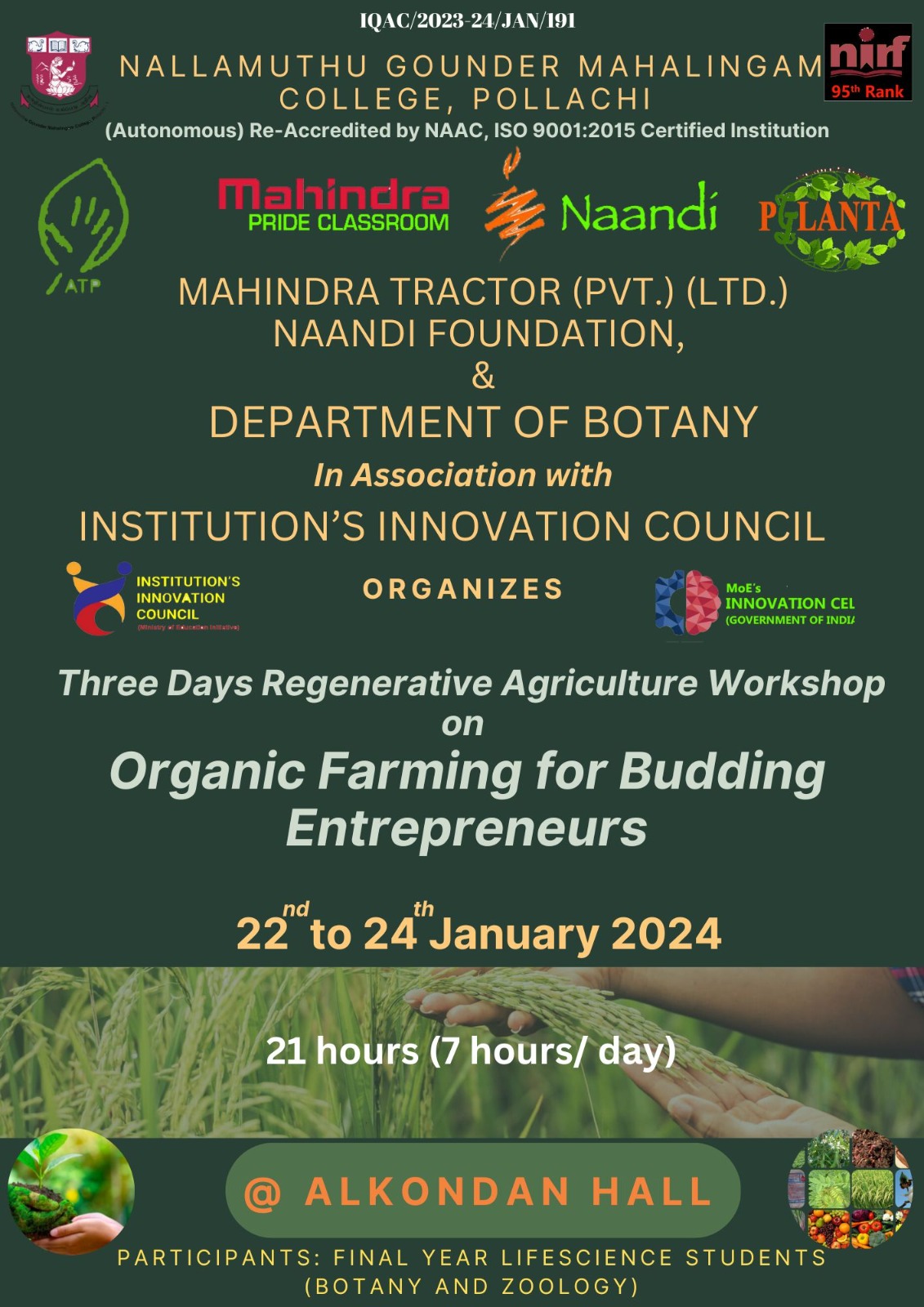 On 22 January 2024 , three days regenerative agriculture workshop on “Organic farming for budding entrepreneurs” organized by the Department of botany along with Mahindra Tractor (PVT.) (LTD.), Naandi Foundation and the Institution Innovation Council. This Programme mainly focused on organic farming and its importance, encouraging the participants to explore the unique features and opportunities of professional development in society.
