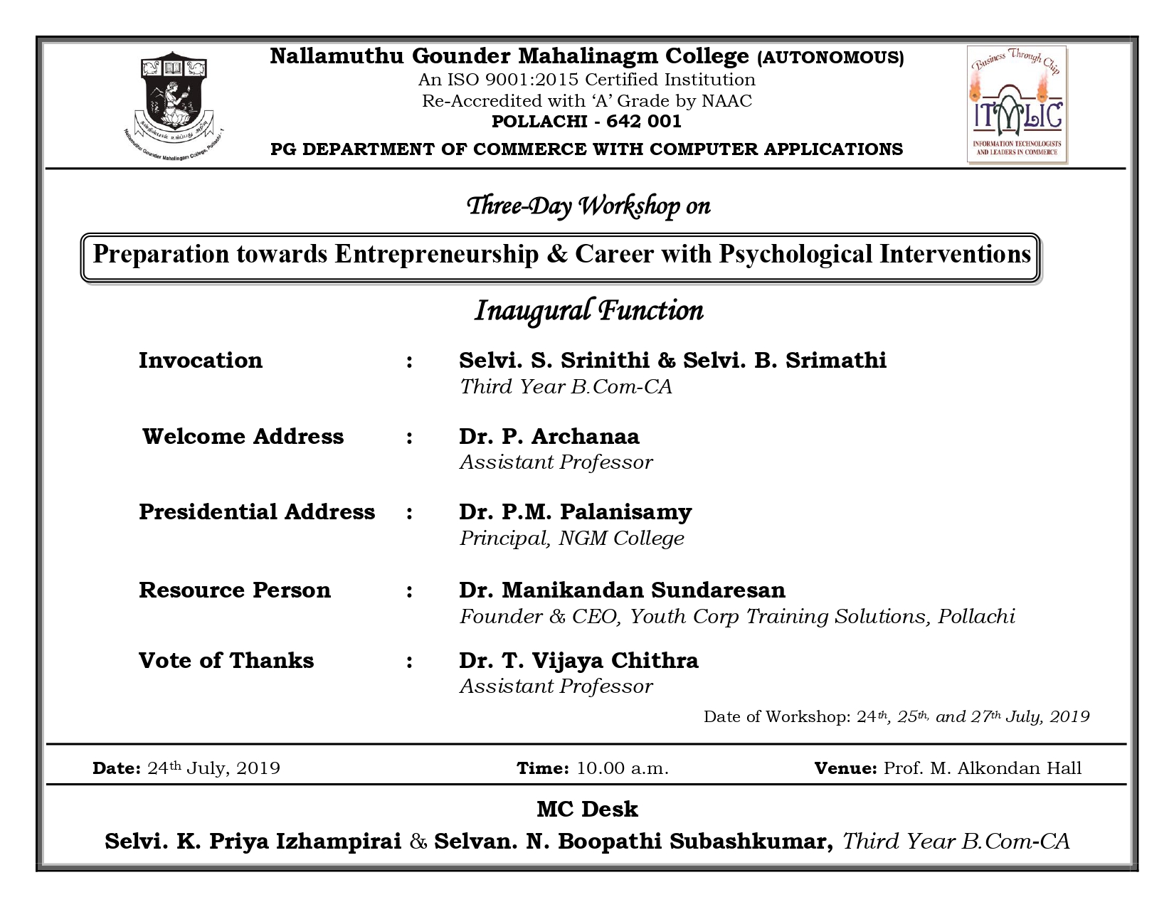 Three days Workshop on “Preparation towards Entrepreneurship & Career with Psychological Interventions” 2019