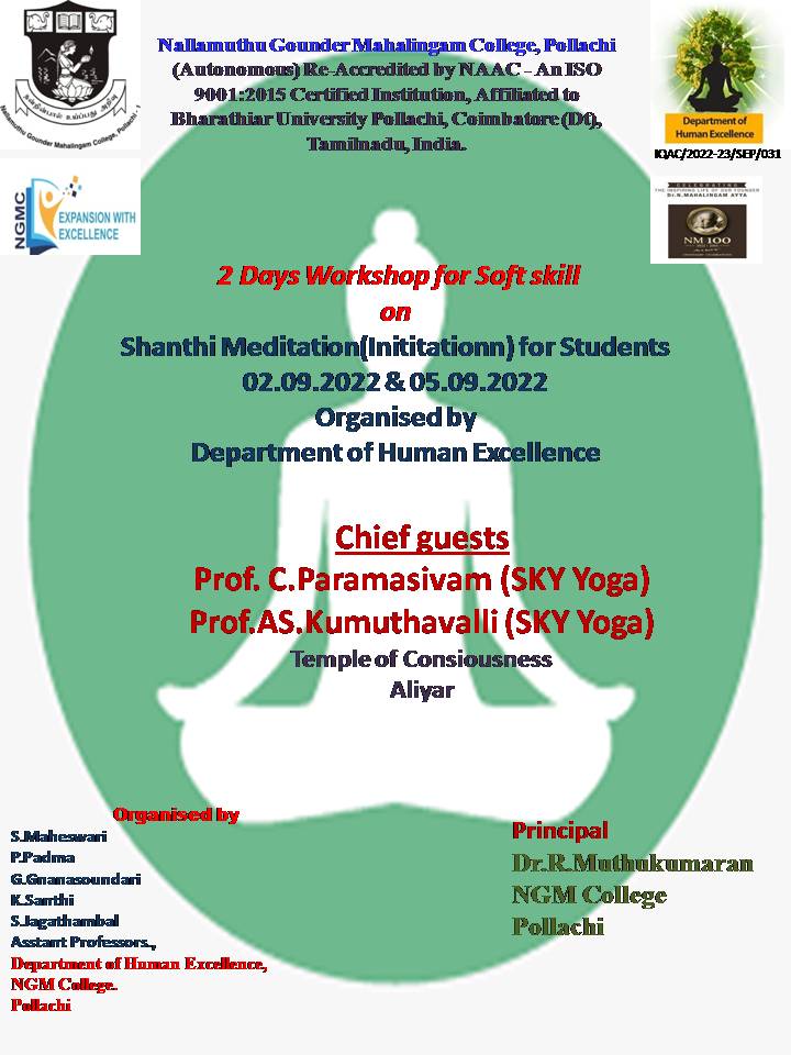 The Department of Human Excellence was conducted two days workshop for soft skill development in the title of mediation Tesuquein agan. From 02.09.2022 to 05.09.2022. First day 950 students were participated for agan inititation. In the morning was conducted by the prof. C.Paramasivam, SKY Yoga from temple of Conciseness at Aliyar. In the morning was conducted by the prof. AS.Kumuthavalli, SKY Yoga from temple of Conciseness at Aliyar. All the students benefited by this program.