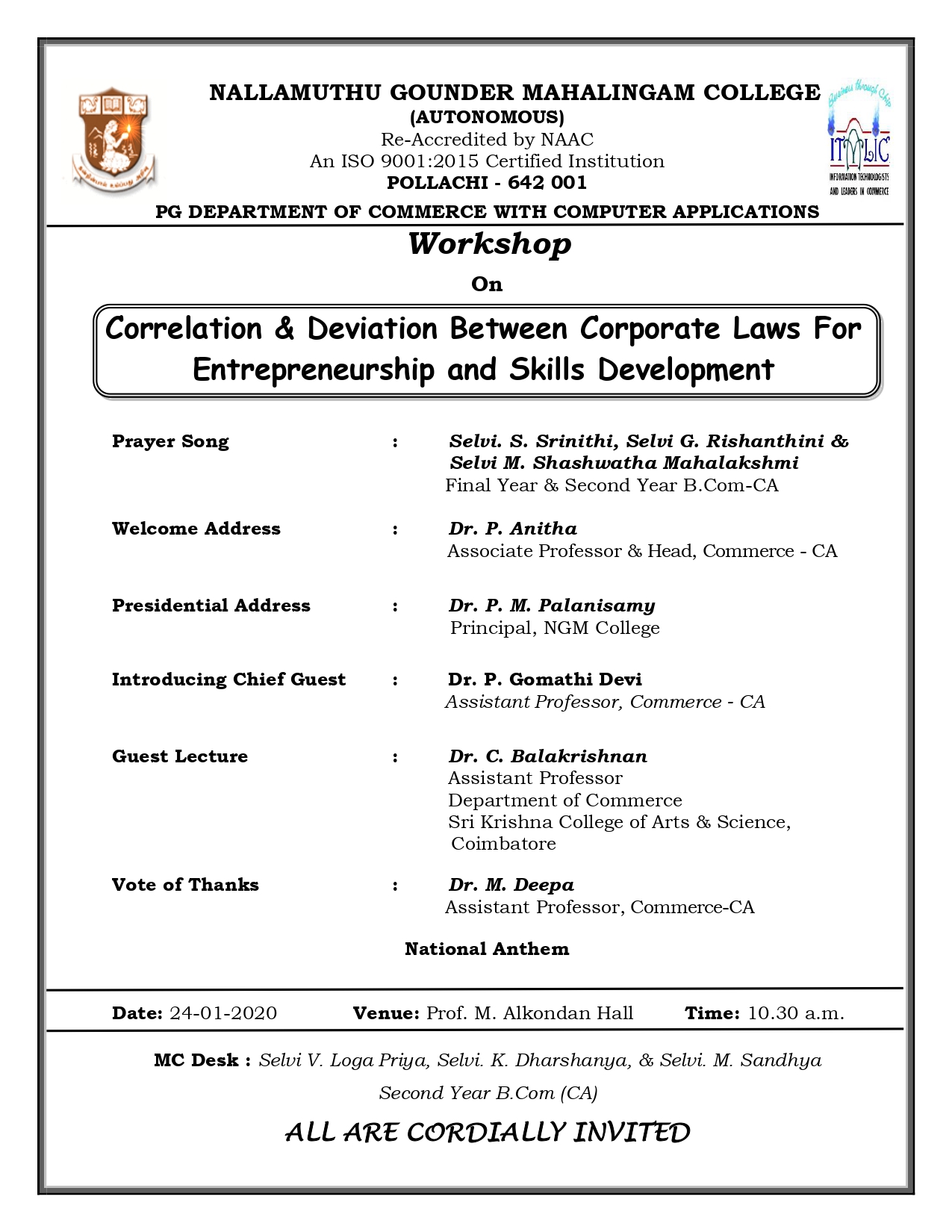 Workshop on Correlation & Deviation Between Corporate Laws For Entrepreneurship and Skills Development 2020