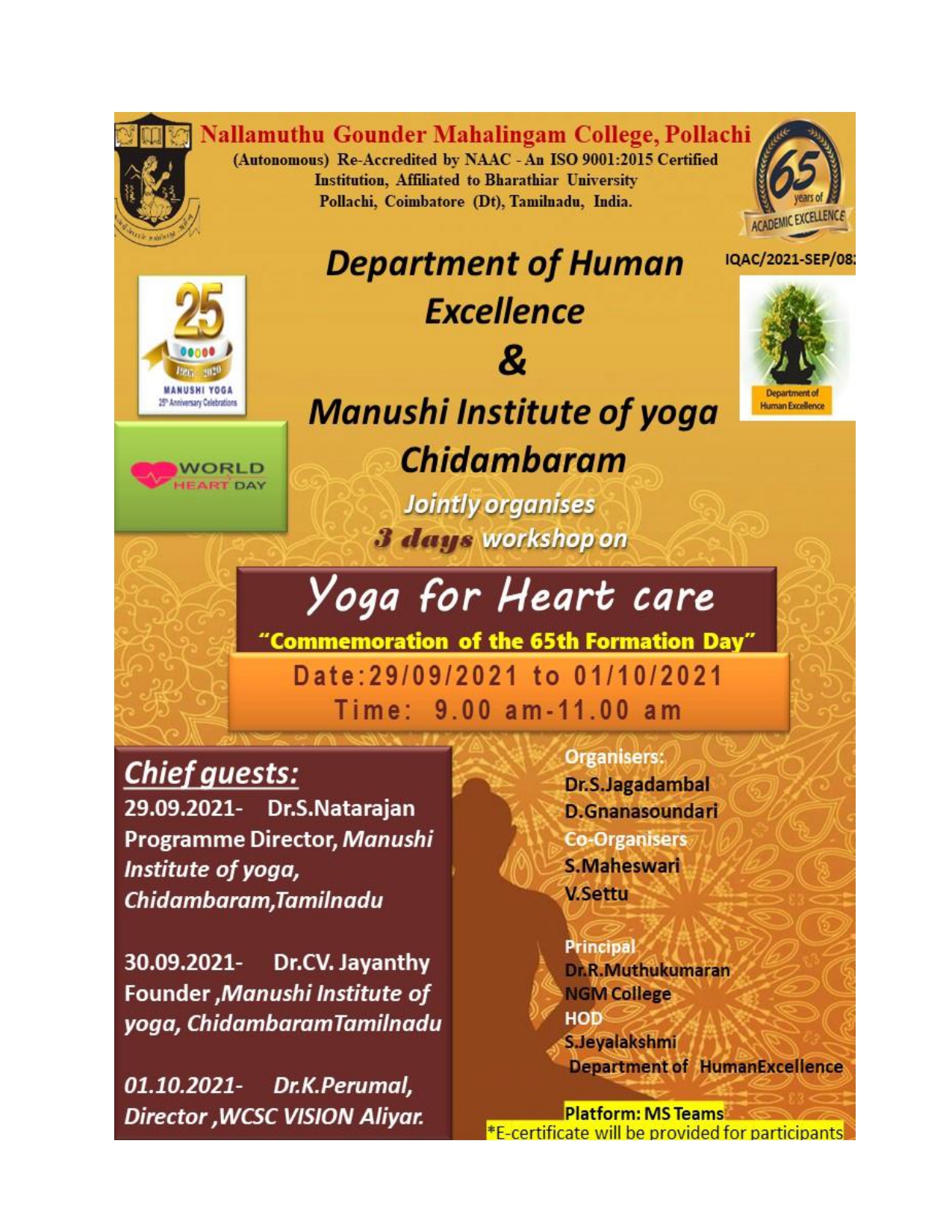 Welcome Address was given by Dr.S.Jagadambal, Asst.Prof, Department of Human Excellence, Introduction of Chief Guest- Prof. D. Gnanasoundari. Resource Person was Dr. S, Natarajan, Programe Director, Manushi Yoga Institute,Chidhambaram. Topic- ‘Asanas for Healthy Heart’ Vote of thanks was given by Dr. S.Jagadambal. Asst.Prof, Department of Human Excellence.