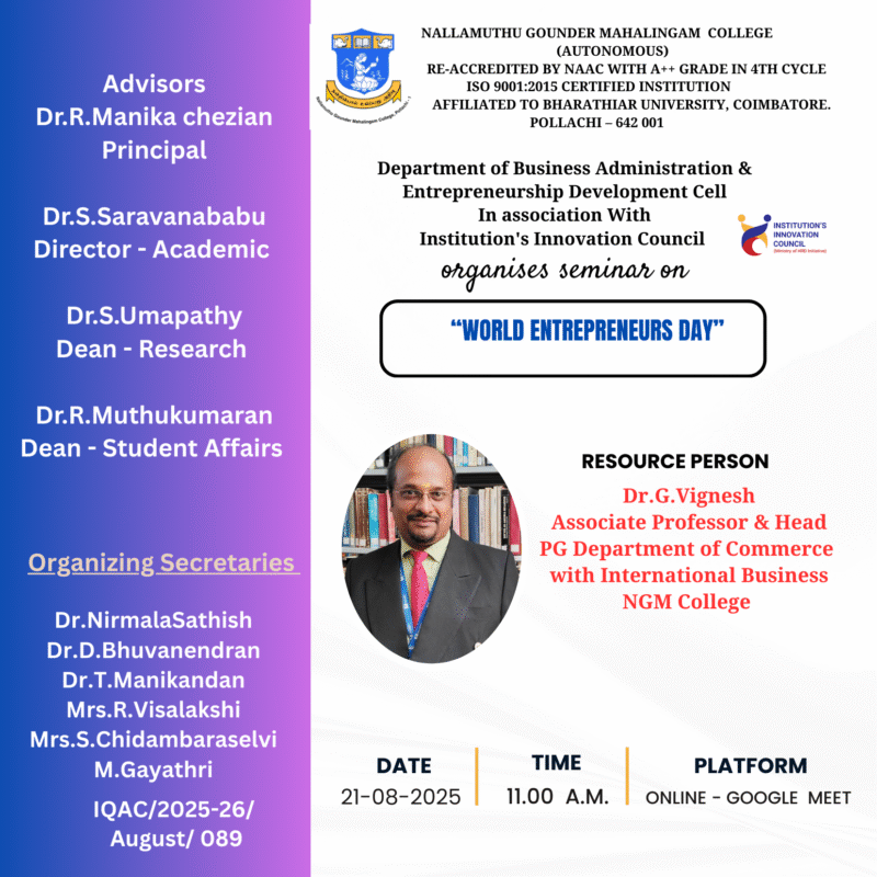 Dr. G. Vignesh, Associate Professor and Head, PG Department of Commerce with International Business, NGM College