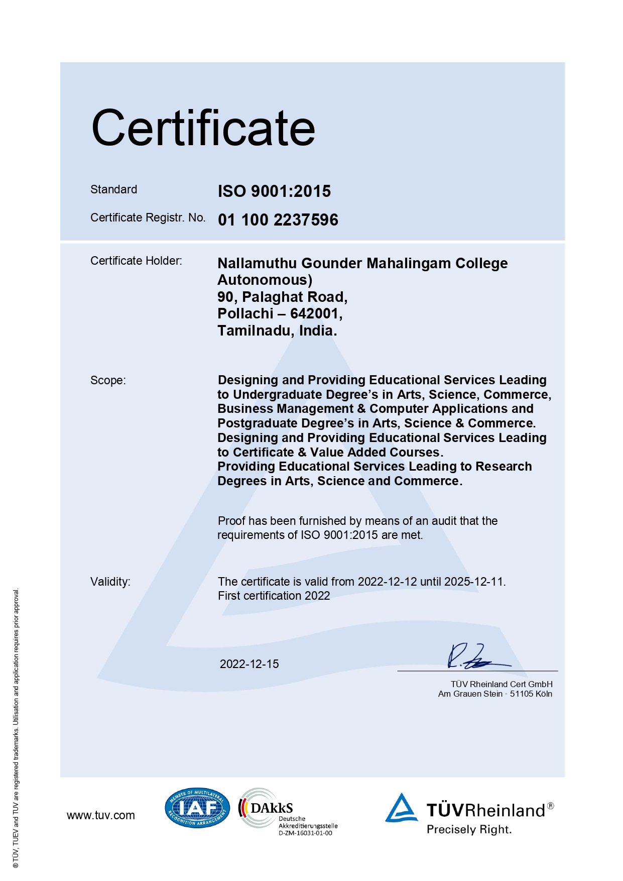 ISO certification was opted for by our college to provide quality service to all its stakeholders. With its quest for Quality Education, the college believes that academic excellence can be achieved solely through proper monitoring systems. Hence ‘Surveillance Audit‘ is conducted periodically to attain standard in Quality compliance. A well-framed quality system is adopted to ensure excellence in designing and providing Educational Services leading to Degrees in Arts, Science, Commerce & Computer Applications and Post Graduate Diploma in Computer Applications & Business Administration. The college was awarded ISO 9001:2000 certification by TUV Rheinland, Germany in May 2005. The Certificate had been extended further an ISO 9001:2008 since 2011.The latest version of the standard ISO 9001:2015 was certified in April 2018 to maintain the Standards.